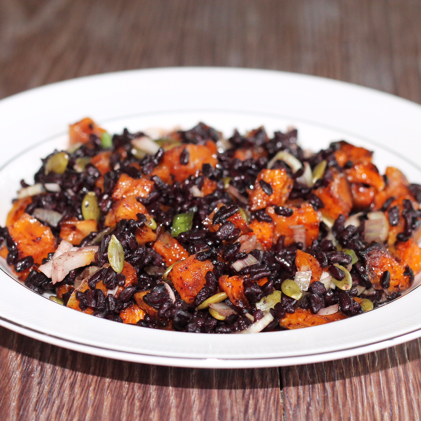Once the rice is ready, take it off the heat and put it in a bowl. Add the butternut, spring onion and pumpkin seeds.