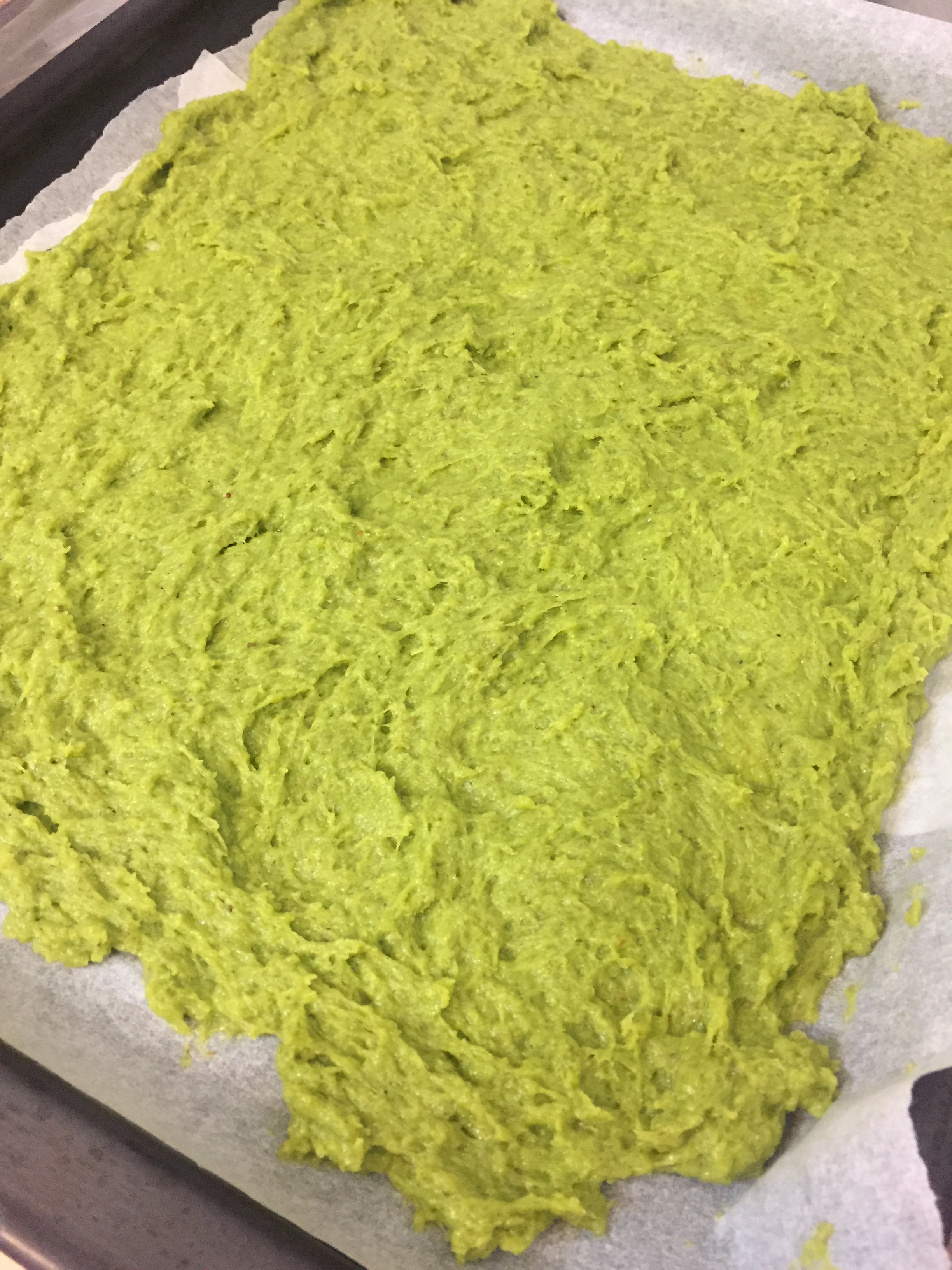 Line a large baking tray (about 30cm x 40cm) with baking paper and then spread the mixture out onto the paper, as thinly and evenly as you can. The easiest is to use the back of a metal spoon, as this sticks to the mixture, helping you to pull and stretch it into a thin base (plastic doesn’t work as well.)