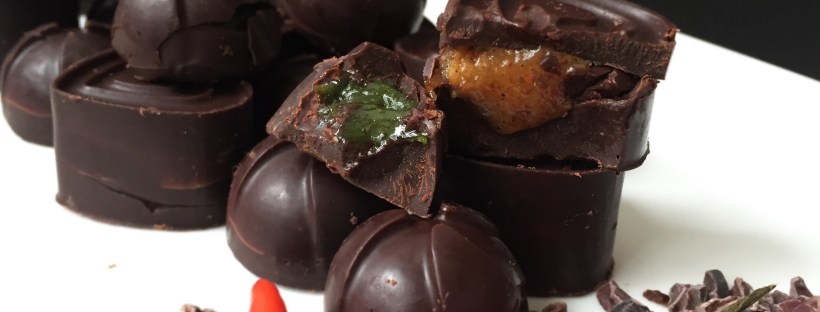 Fill your moulds with chocolate one third of the way, making sure to use only half of the chocolate. If you don’t have moulds, ice trays work just as well. Place in the freezer until set. Now use a small spoon to make a little ball of the set caramel and drop into the centre of the mould, trying to avoid the sides of the mould. Use the maca-chilli caramel for half of the moulds and the lemongrass-wheatgrass caramel for the other half. Fill the moulds with the remaining chocolate so that it pours around the caramel, and covers it. Place in the freezer again until set.