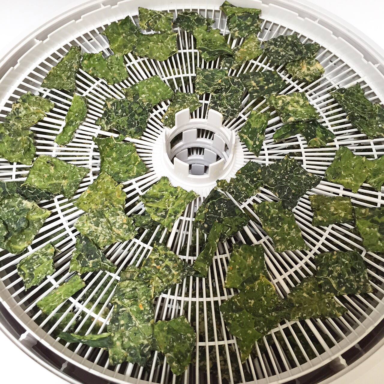 Spread the leaves out on your dehydrator sheets, making sure that none of them are clumped together, as these will dry into chewy lumps, not individual crispy pieces. Dehydrate on 45 C overnight. Store in an airtight container and consume within 2 weeks. If you have high humidity you may need to eat them faster before they become limp!