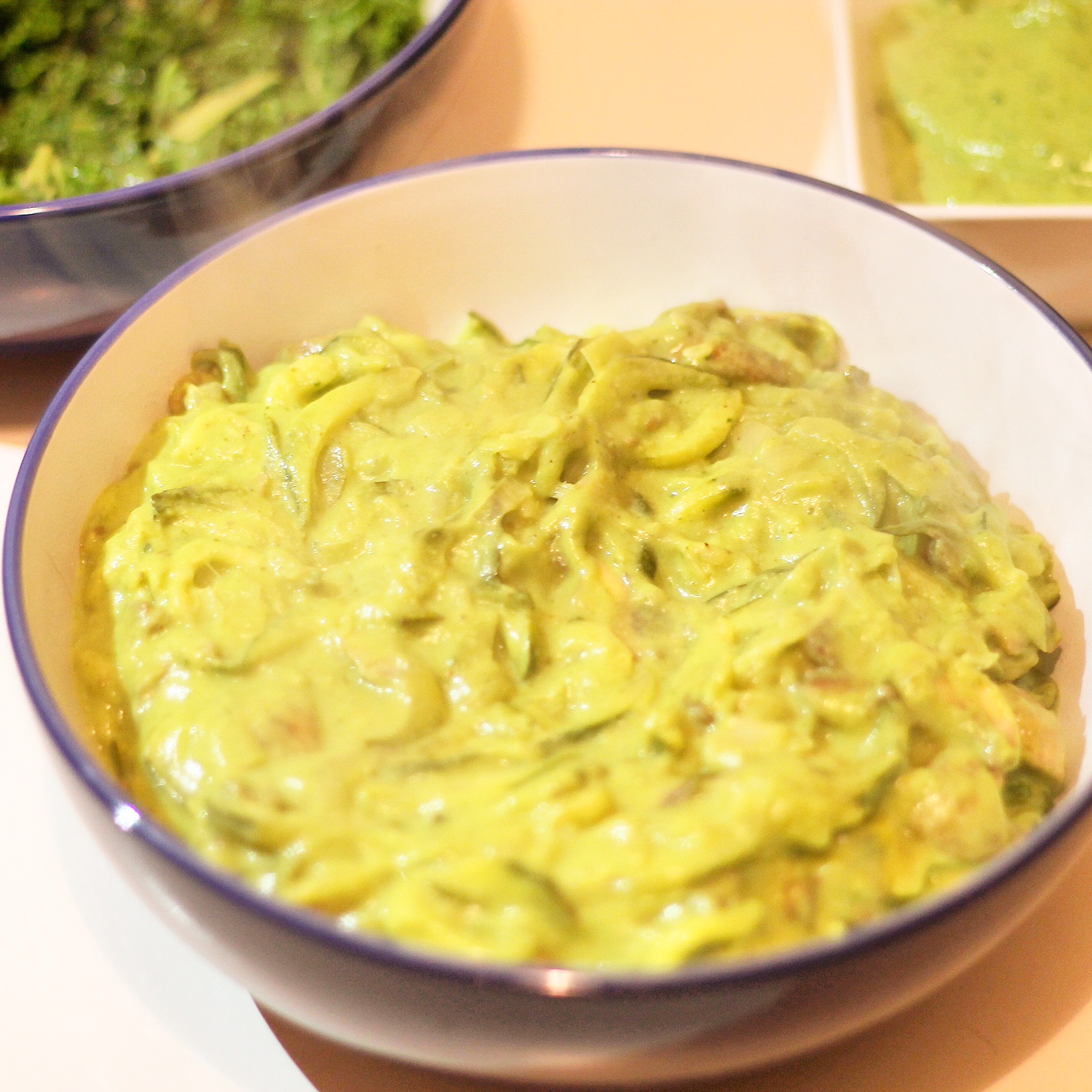 It seems that everyone is jumping on the spiralizer bandwagon these days which is great! All these utensils give us more resources to be able to cook healthily more often, and in less time. It honestly takes about 60 seconds to put two courgettes through a spiralizer. I decided to go for a tagliatelle shape this time. I had some mushrooms and leeks in the fridge along with my courgettes so decided to mix all three together and the result was delicious. Added to it my creamy Vegan Pesto, you can’t go wrong! Either as an accompaniment to a meal or as a meal itself with some salad – just yum!